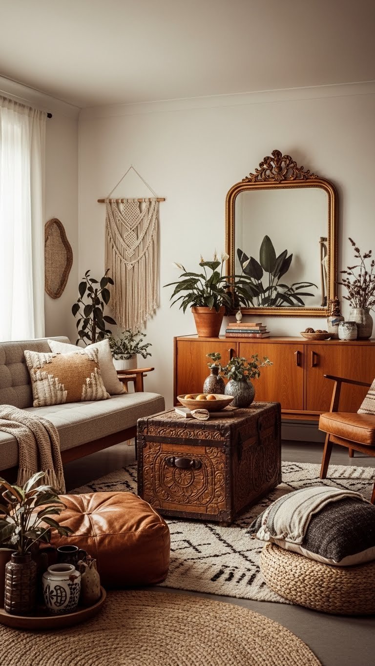 If you want a boho room that feels collected rather than staged, pair a streamlined modern sofa or console with one or two vintage statement pieces—a mid-century sideboard, a carved wooden trunk, or an ornate mirror—to anchor the space and add history.