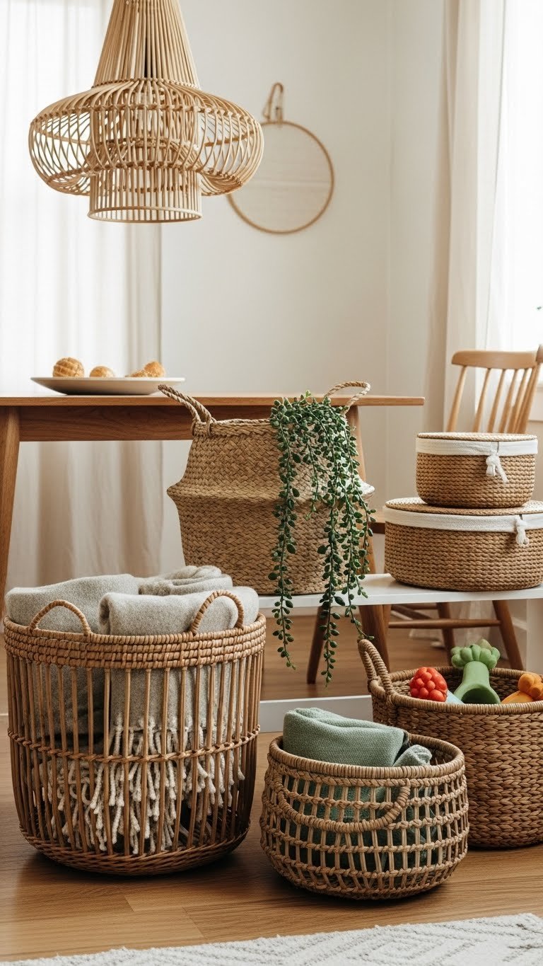 Hang a basket chandelier for sculptural interest, or tuck stacked baskets on shelves—practical, airy, and effortlessly free-spirited.