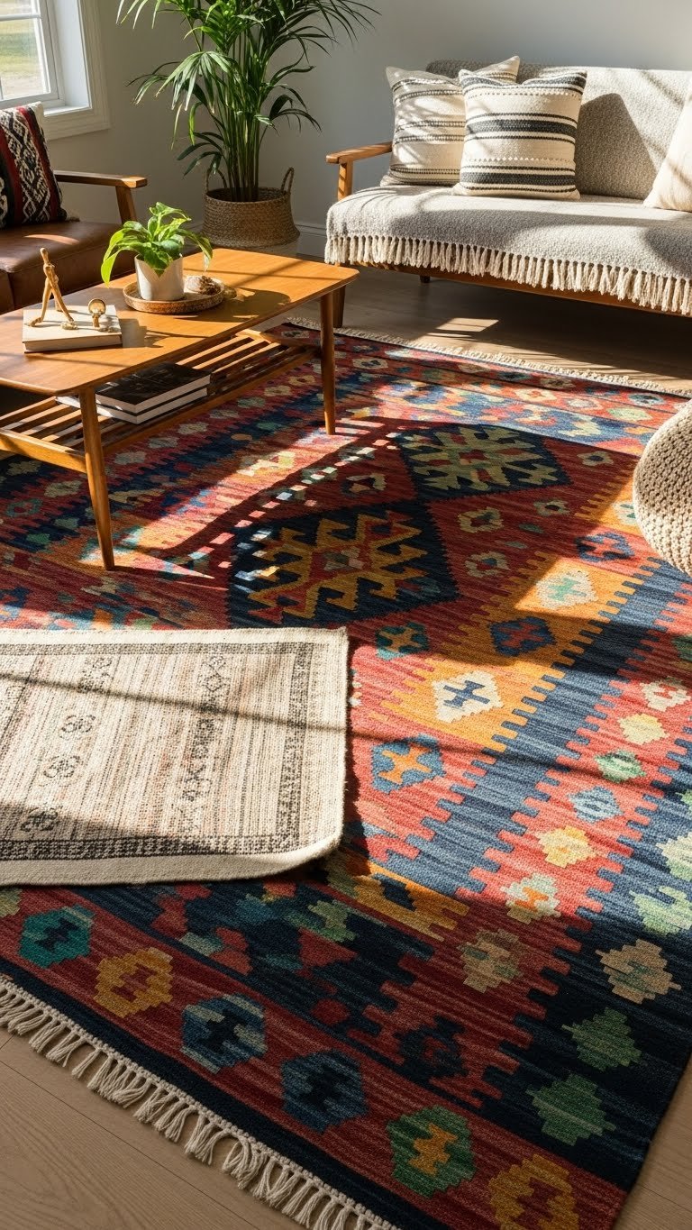 Pull the warmth and storytelling of your kilim into seating arrangements that invite lingering conversations. Arrange low sofas, poufs, and a pair of chairs in circular seating to encourage eye contact and intimate conversation. Keep pieces movable, mix textures, and leave breathing room so the cluster feels casual, honest, and free—perfect for relaxed gatherings and spontaneous storytelling.