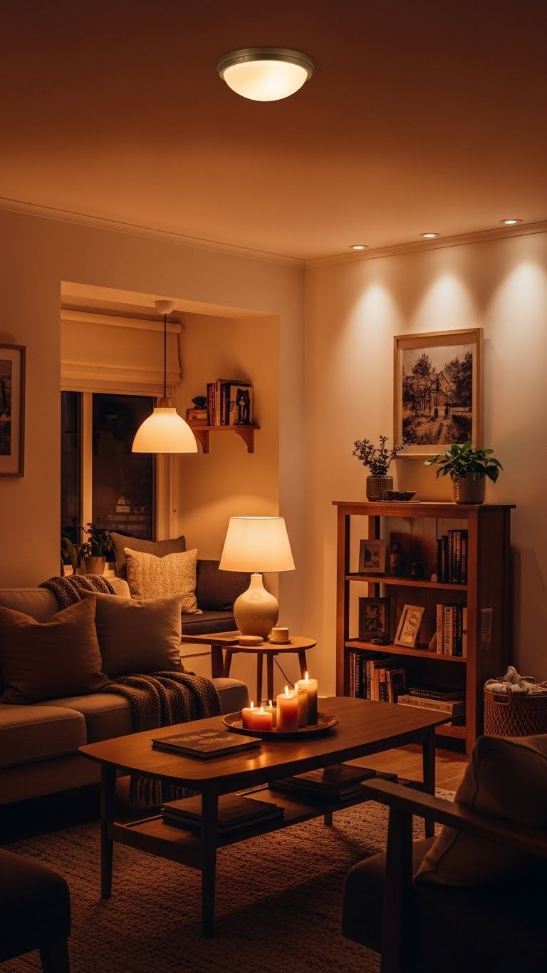 Combine overhead, task, and accent lights so you control scene and mood. Add mood dimmers and warm bulb temperature to soften edges. Let lamps, pendants, and candles create zones that invite lingering, spontaneity, and relaxed freedom.
