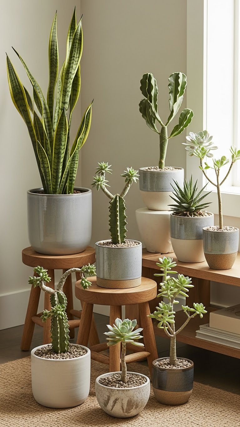 You’ll want plants that act like living sculptures—architectural, low-maintenance, and textural—so they add shape without demanding constant care. Choose sculptural options like succulent sculptures in ceramic pots and tall snake plants to anchor corners. They require minimal watering, resist neglect, and age gracefully. Group varied heights for effortless composition, and let natural light do the styling so you stay free to roam.