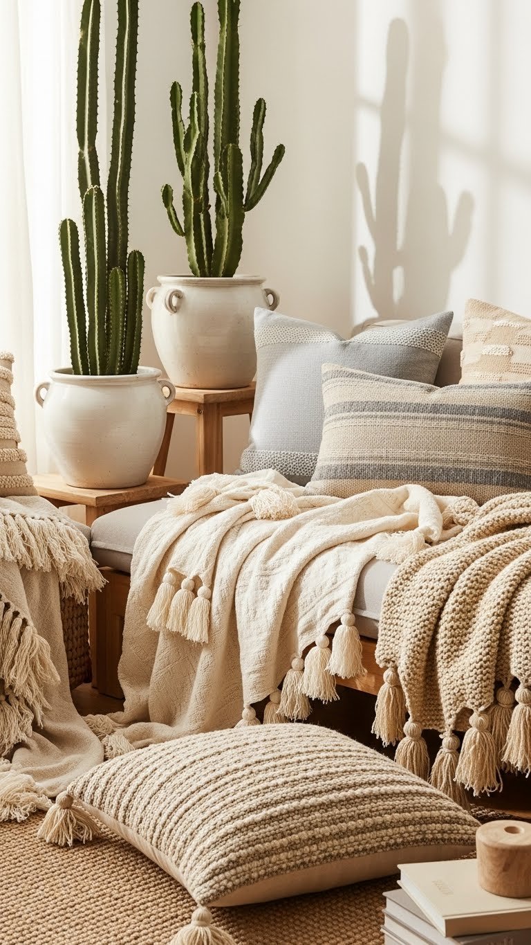 With sculptural plants anchoring your corners, soften the room by layering in fringed throws and textured cushions that add warmth and movement without clutter.