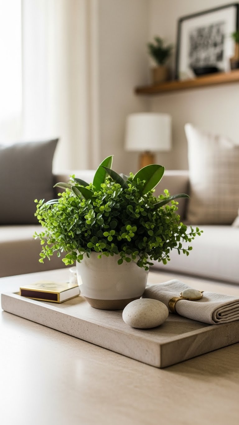 A low tray centerpiece gives your coffee table an organized, gallery-ready feel—anchor it with a lush green plant (think a compact fern, pothos, or small fiddle leaf) to introduce life and scale.