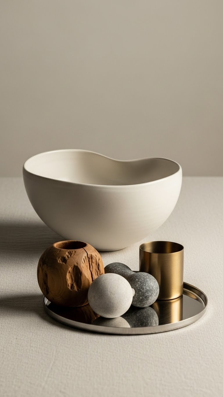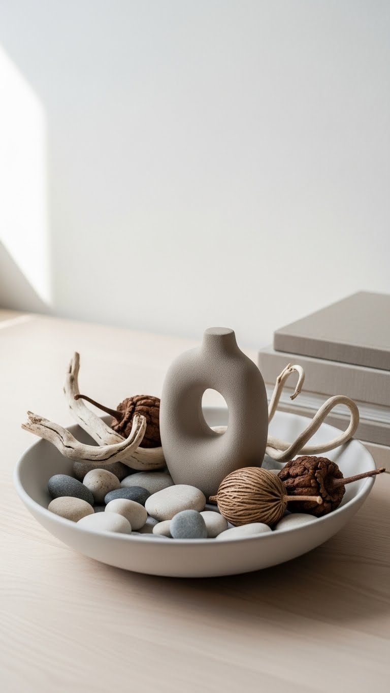 After using books to elevate a single form, bring the eye lower with a shallow bowl that gathers natural elements around a matte sculpture—this keeps the composition grounded while preserving that airy, curated feel. You’ll mix earthy textures—dried seed pods, smooth pebbles, driftwood—so the matte contrast of the sculpture reads modern. Arrange loosely, leave negative space, and let pieces breathe.