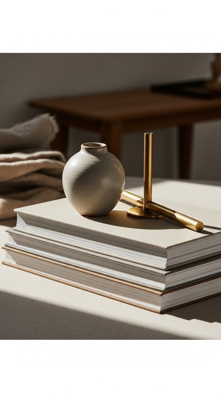 After you’ve played with scale and texture, try stacking a few hardcover books as a low, horizontal base and topping them with a small ceramic vessel and a slim brass accent to create a refined, layered vignette.