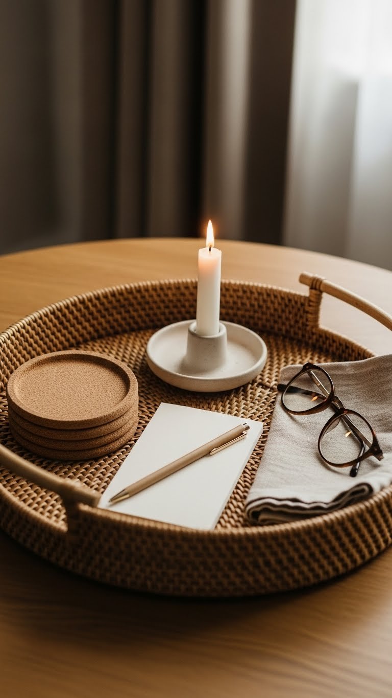 Anchor your table vignette with a woven tray that corrals essentials—a stack of coasters, a small notepad and pen, and a neatly folded pair of reading glasses—paired with a single candle to add warmth and focus. You’ll use rattan essentials for texture, arrange items with intentional negative space, and master candle placement so the flame becomes a calm focal point that invites relaxed, uncluttered living.
