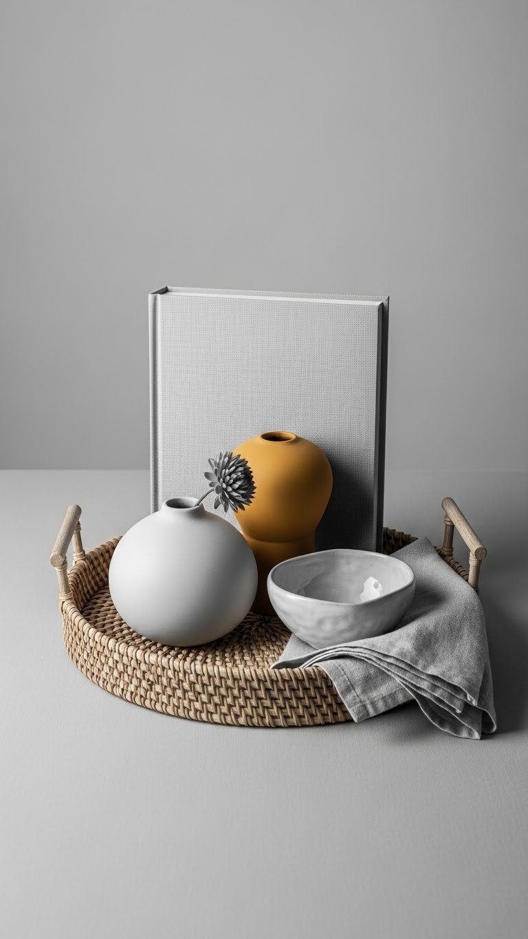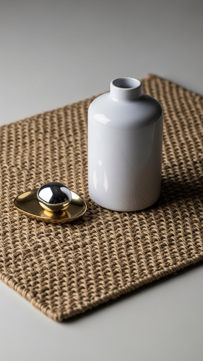 When you layer a coarse woven mat under a glossy ceramic vase and finish with a small metal accent, the contrast reads instantly curated and deliberate.