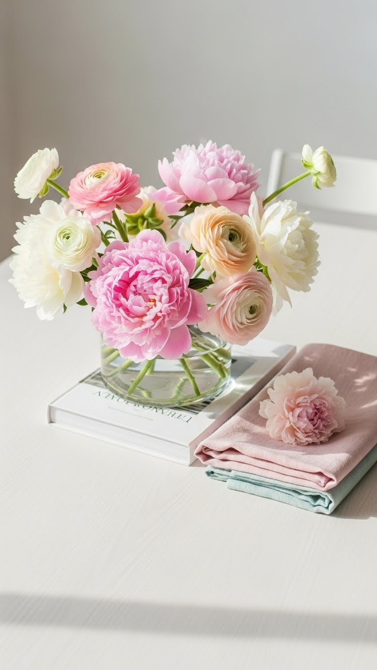 Swap out the rattan vignette for a breezier setup: fresh blooms in a low, clear vase, a folded lightweight linen in soft pastels, and a single seasonal book to anchor the look. You’ll welcome seasonal blooms, swap linens with a mindful linen rotation, and keep the table airy. Choose one focal color, trim stems cleanly, and let negative space speak freedom.