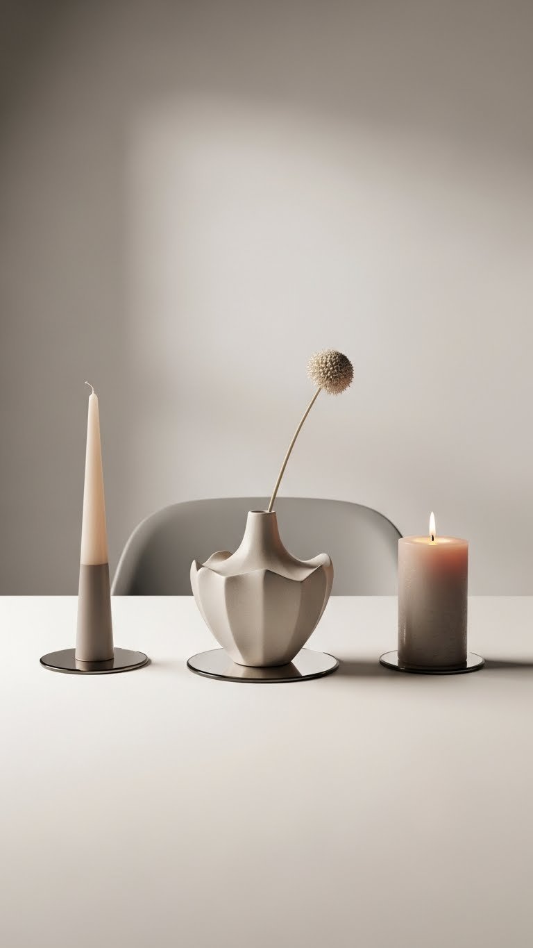 [IMAGE PROMPT: A minimalist tabletop still life featuring three candles of varying heights clustered on a textured tray (ceramic or concrete) centered in soft, warm natural light. The candles include a matte-finish pillar, a glossy taper, and a medium-height rustic candle; their wicks are neatly trimmed. Include a small contrasting element—either a delicate sprig (eucalyptus or rosemary) laid beside the candles or a smooth decorative stone—placed asymmetrically on the tray. Subtle scent cues can be suggested through faint wisps of smoke or a slightly blurred background with a small diffuser bottle. Materials and finishes should be clearly distinguishable (matte vs. glossy vs. rustic texture). The scene should feel sculptural, deliberate, and effortlessly styled, with neutral tones, soft shadows, and a shallow depth of field. Photorealistic, high-resolution, 3:2 aspect ratio.]
