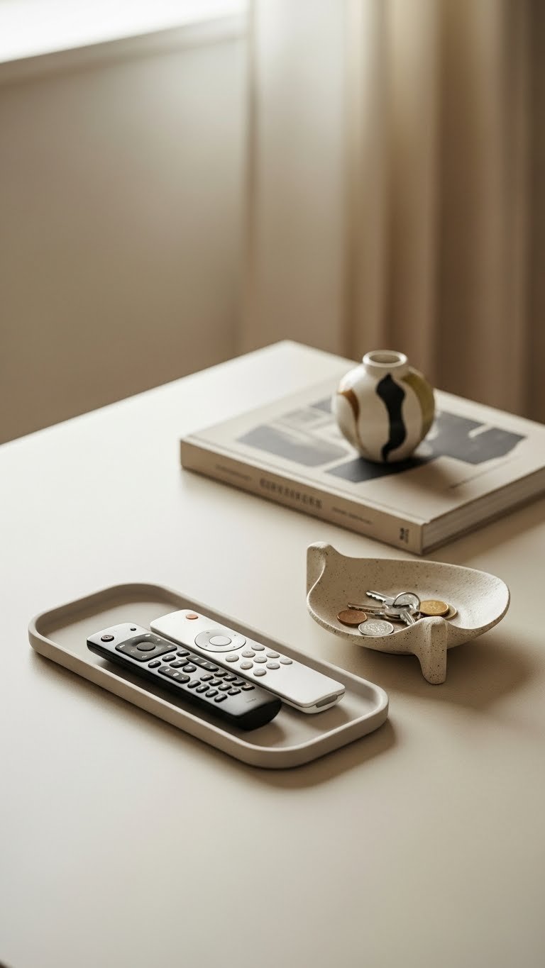 Corral remotes in a low-profile tray and pair it with a decorative dish to keep essentials organized without killing the table’s visual flow. You’ll favor a lean silhouette: one remote organization tray, a small decorative dish for keys or coins, and a single sculptural book.