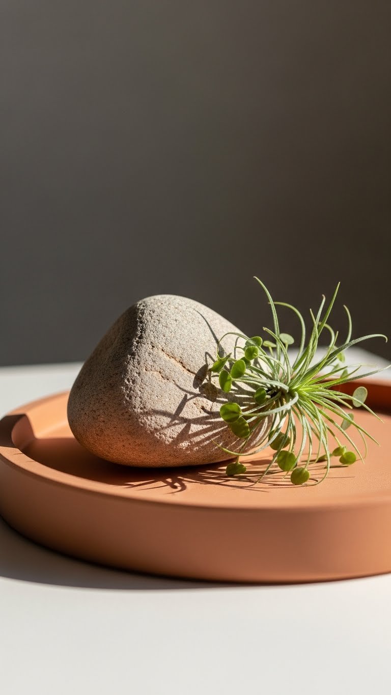 Balance comes alive when you pair an organic stone object with a round tray and a small plant—place the smooth, irregular stone slightly off-center on a low, warm-toned tray, then tuck a compact, airy plant beside it so the curved forms converse across negative space.