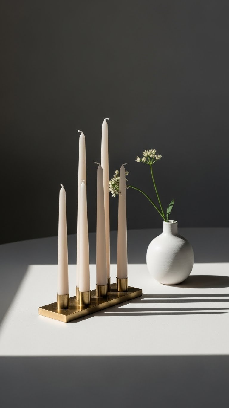 Several taper candles at varied heights create an architectural rhythm on your table, their tapered silhouettes punctuating the air while a small, simple vase anchors the grouping.