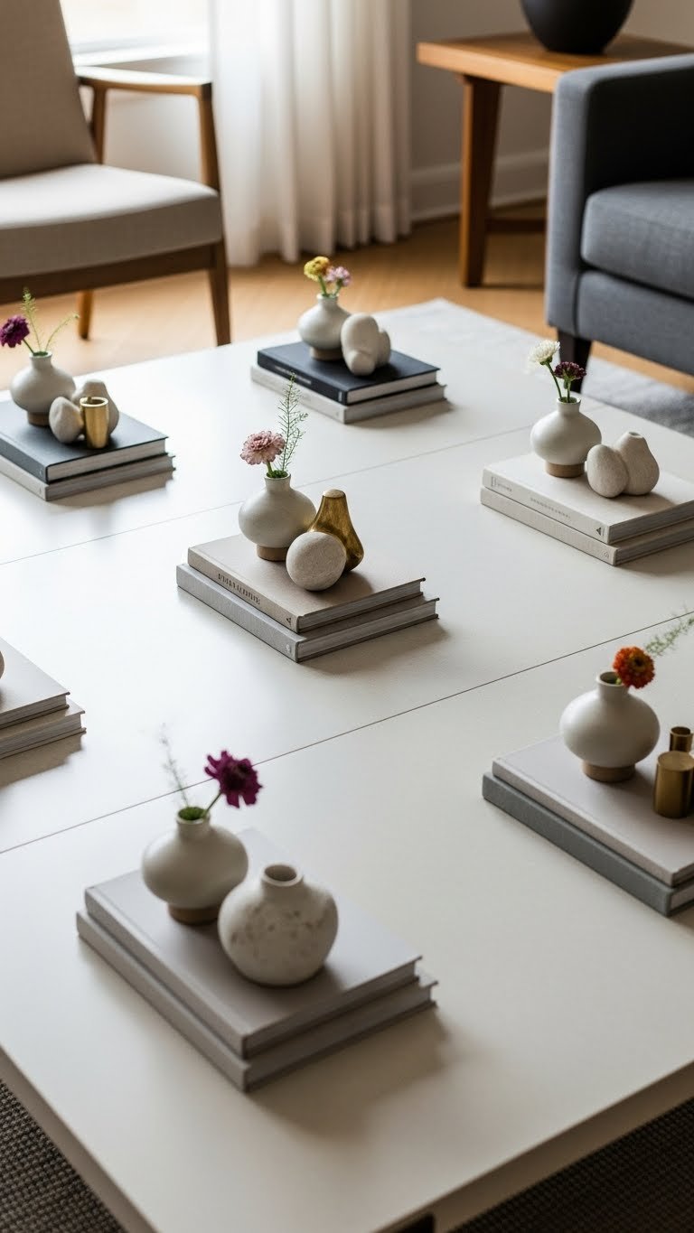 Often you’ll repeat small, curated clusters across a large coffee table to create rhythm and intimacy without crowding the surface. You’ll place mini clusterings—a low vase, a stack of slim books, and a sculptural object—at measured intervals.