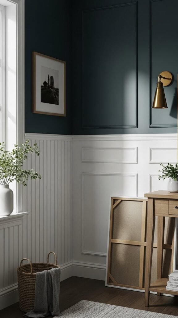 If you want to ground a deep, saturated paint color and add instant architectural interest, install classic wainscoting or raised paneling—it’s the quickest way to make walls feel finished and intentional.