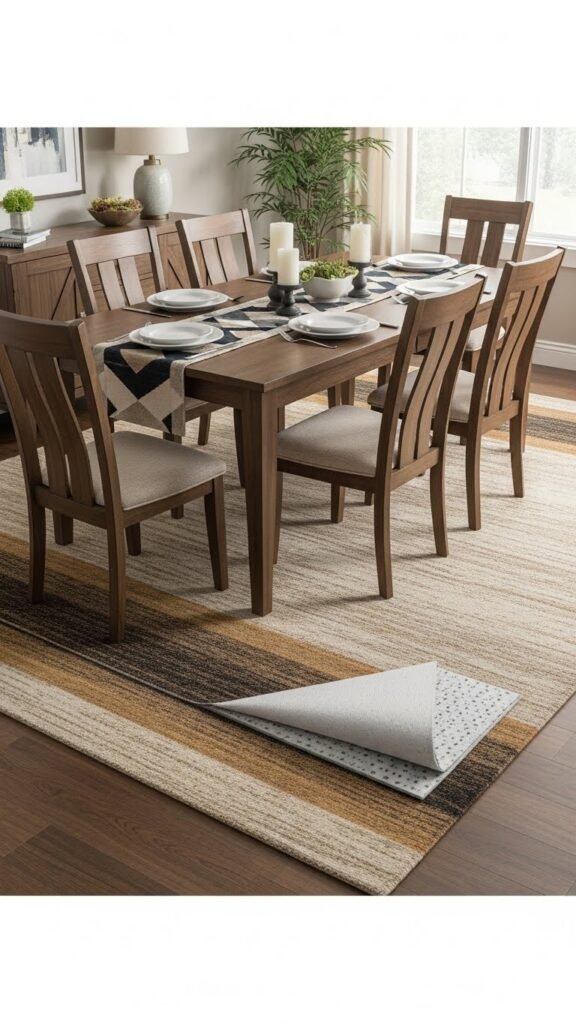 Anchor your dining table with a properly sized rug to define the zone and keep chairs from catching on edges; aim for at least 24 inches of rug extending beyond the table on all sides so chairs remain on the rug whether pushed in or pulled out. Choose quality rug padding, pick proportions that breathe, and use geometric layering to add bold structure without clutter, letting your space feel free.