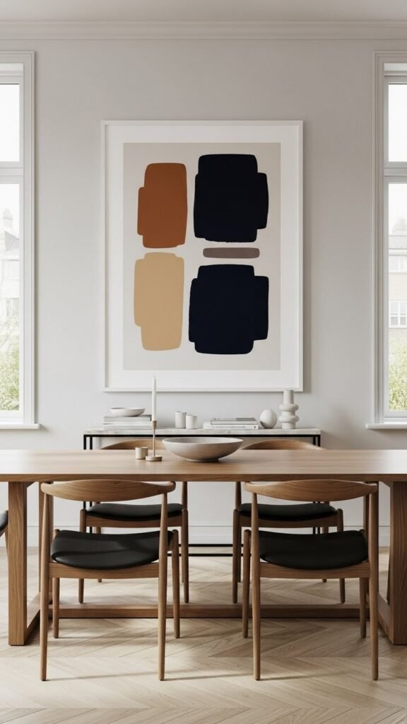 Anchor your dining room with a single large-scale artwork or a carefully balanced gallery wall that sets the room’s tone and scale.
