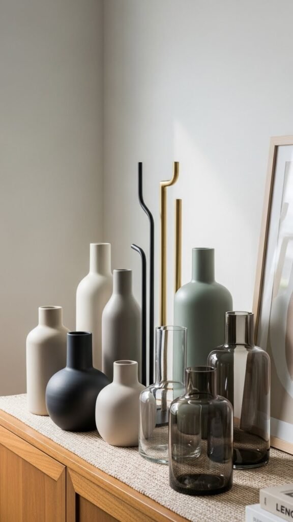 Pull together a collection of curated vases and sculptural objects to give your dining room personality and tactile interest. Choose matte ceramic pieces alongside metal and glass to create contrast. Arrange items in groups of odd numbers, vary heights, and let asymmetrical forms breathe. You’ll build a confident, uncluttered display that feels liberated, intentional, and ready to evolve with your taste.