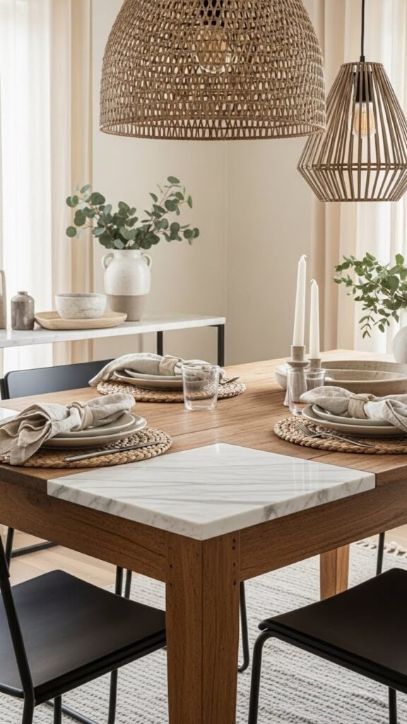 Mix Textures: Wood, Marble, Metal, and Woven Fibers