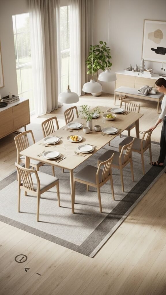 Opt for minimal obstructions, position lighting and rugs to guide flow, and pull chairs fully before guests arrive so movement feels effortless and liberating.