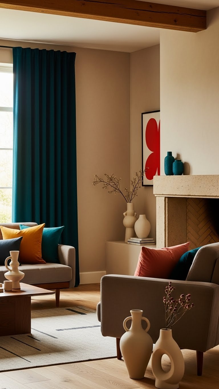 When you pair saturated hues with neutral anchors, you create a dynamic, curated look that feels intentional rather than chaotic. You’ll balance saturated curtains against warm plaster, timber, or stone so color pops without overwhelming. Add contrast pillows to punctuate seating and guide the eye. Choose a restrained palette, commit to bold accents, and let spaces feel liberated, not cluttered.