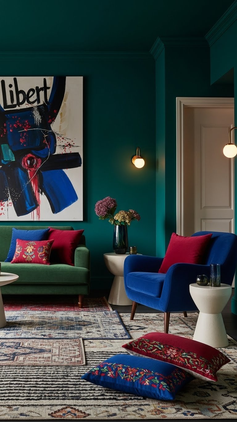 Balance bold walls with lighter accents, layered rugs, and liberated art.