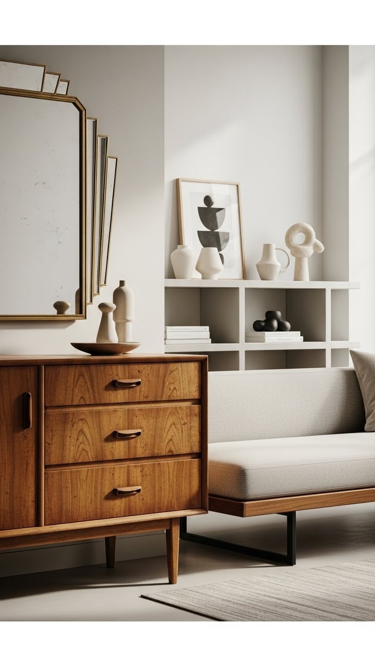 Contrast is your greatest asset when you mix vintage finds with modern lines: pair a mid-century dresser or an Art Deco mirror with a streamlined sofa or minimalist shelving, and let the older piece become a focal point rather than a match. You’ll embrace patina pairing and sleek contrast, choosing restraint elsewhere so each heirloom or vintage sculptural piece breathes and asserts bold, liberated style.