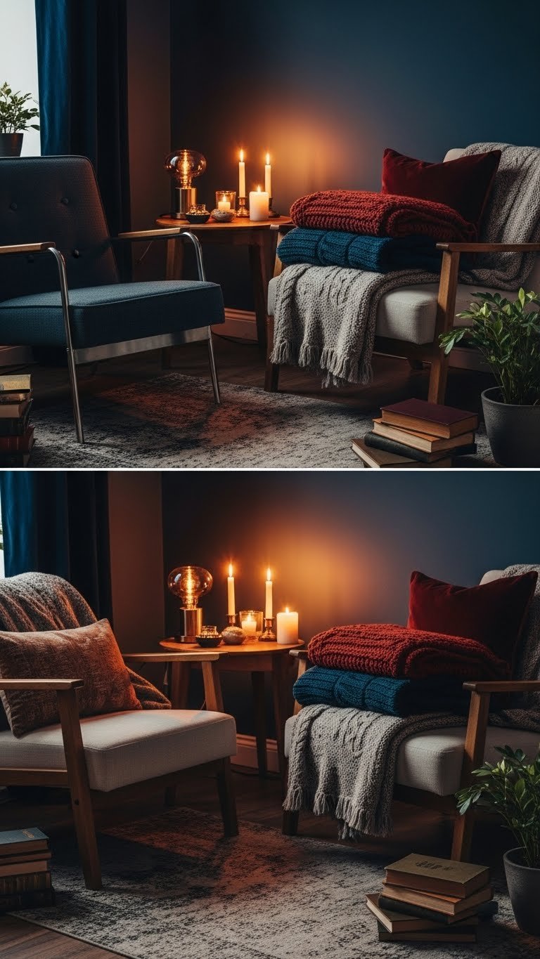 Choose deep indigo walls or textiles, mix in warm woods and tactile throws, and position seating for intimacy.