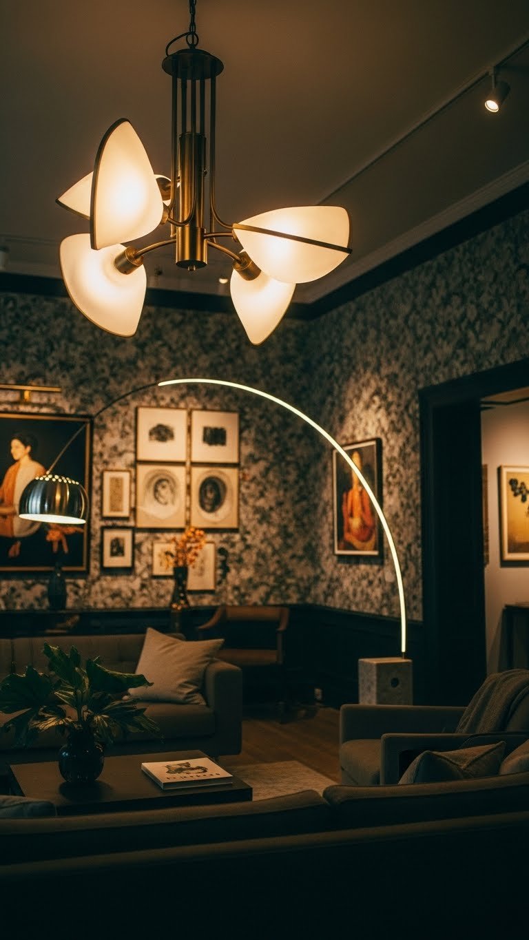 Anchor the room with oversized sculptural lighting that reads like art and performs like a fixture—choose a statement pendant, arc lamp, or chandelier with bold geometry or organic curves to balance your gallery wall and wallpaper. You’ll pick oversized fixtures and sculptural pendants that assert personality, free the space from sameness, and direct light to focal points while keeping scale dramatic and compositionally confident.