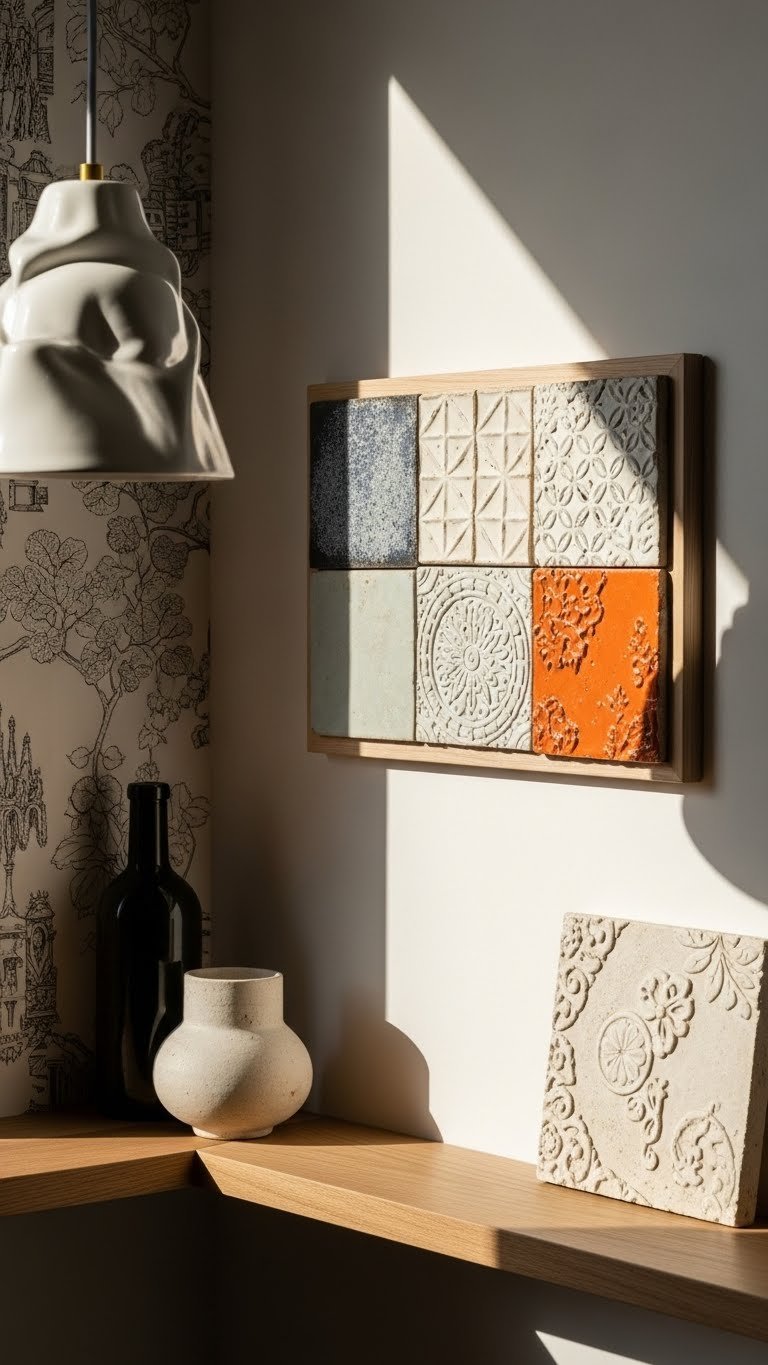 As a tactile counterpoint to printed wallpaper and sculptural lighting, handcrafted tiles bring artisanal detail and sculptural relief into your spaces—you’ll use them sparingly as focal patches, backsplashes, or framed panels to add texture, color, and unmistakable craft.