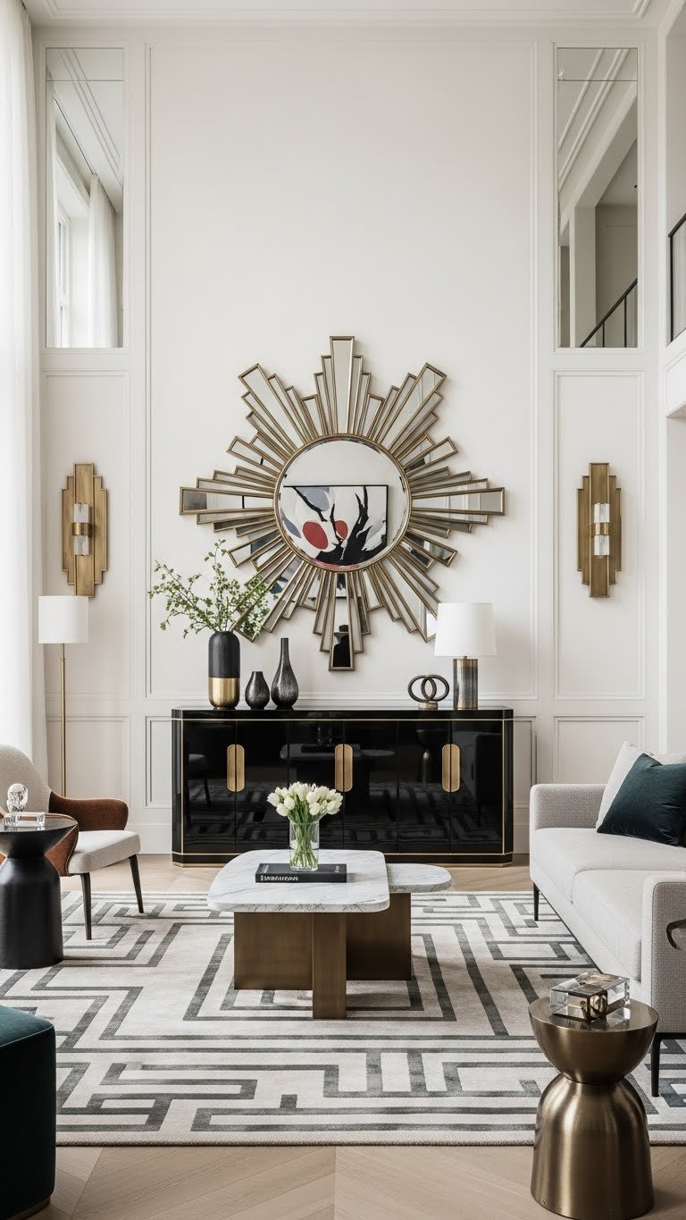 Pull in Art Deco’s glam—think stepped silhouettes, sunburst motifs, and luxe materials—but keep the overall look clean and contemporary by limiting ornament to a few high-impact pieces. You’ll balance bold geometry with airy layouts: place geometric mirrors as focal points, add lacquer accents sparingly, choose streamlined furniture, and let metallics punctuate without overwhelming so your space feels liberated and unmistakably modern.