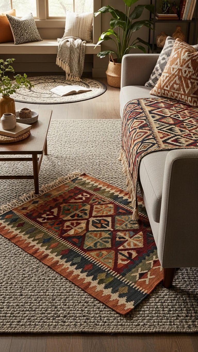 You’ll mix layered kilims with neutral bases, tuck patterned runners under furniture, and balance scale and color.
