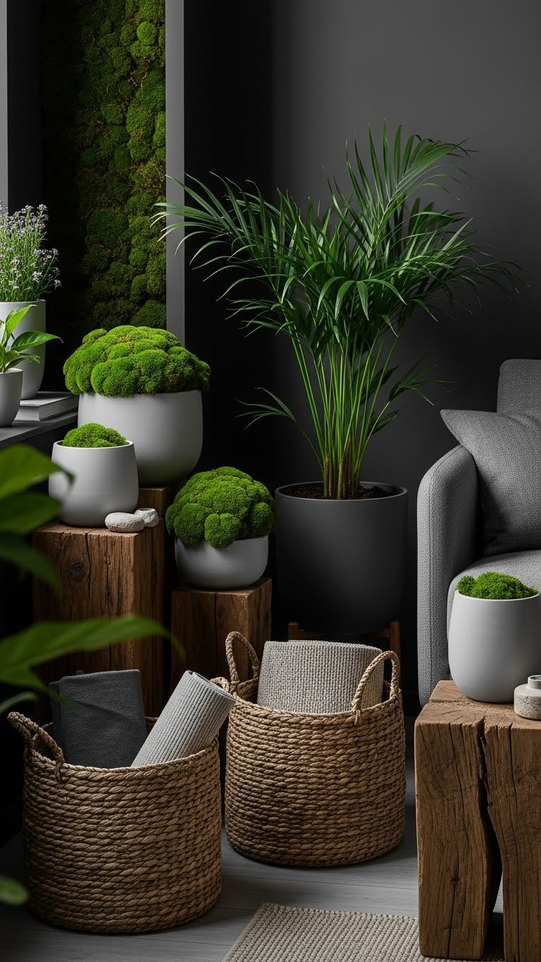 Layering live greenery and natural textures grounds a vibrant monochrome scheme and keeps it from feeling staged. You’ll add living moss in shadowy corners, sculptural palms near seating, and woven seagrass baskets to tidy clutter while adding warmth. Mix matte planters and rough-hewn wood for contrast. Trust your instincts: organic elements free the room, soften intensity, and make bold choices feel effortless and alive.