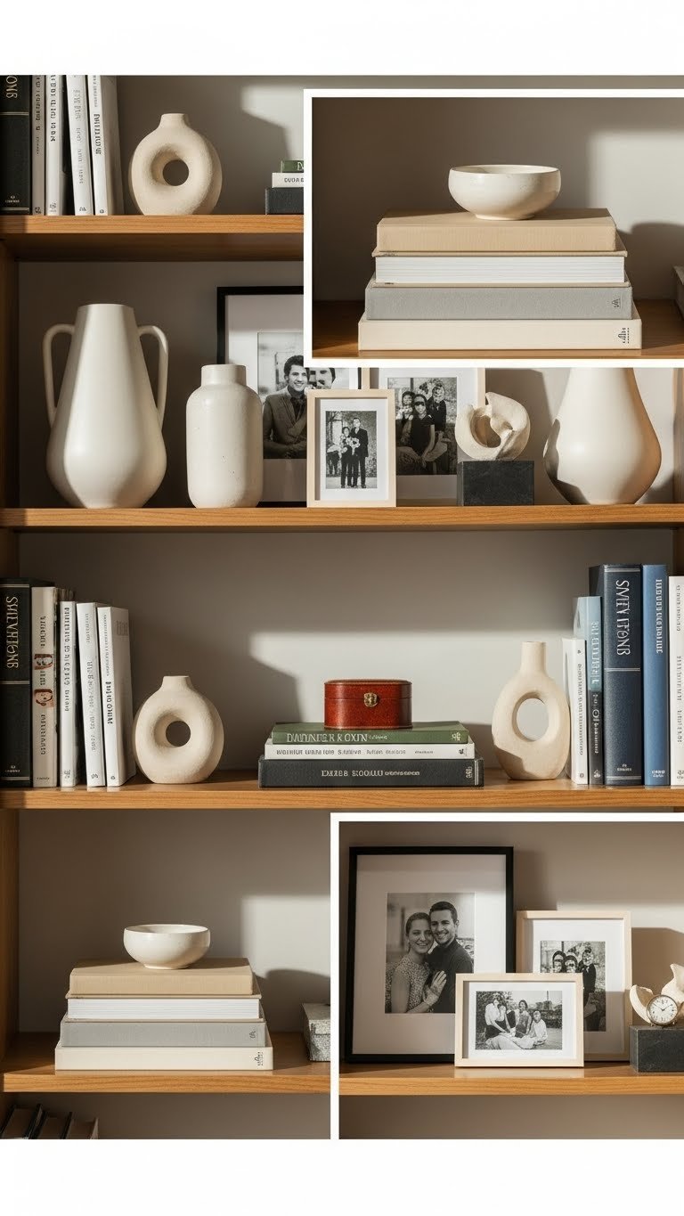Start by editing down what’s on your shelves so each piece earns its place: mix books stored both vertically and horizontally with sculptural objects, framed photos, and a few personal treasures to create rhythm and surprise.