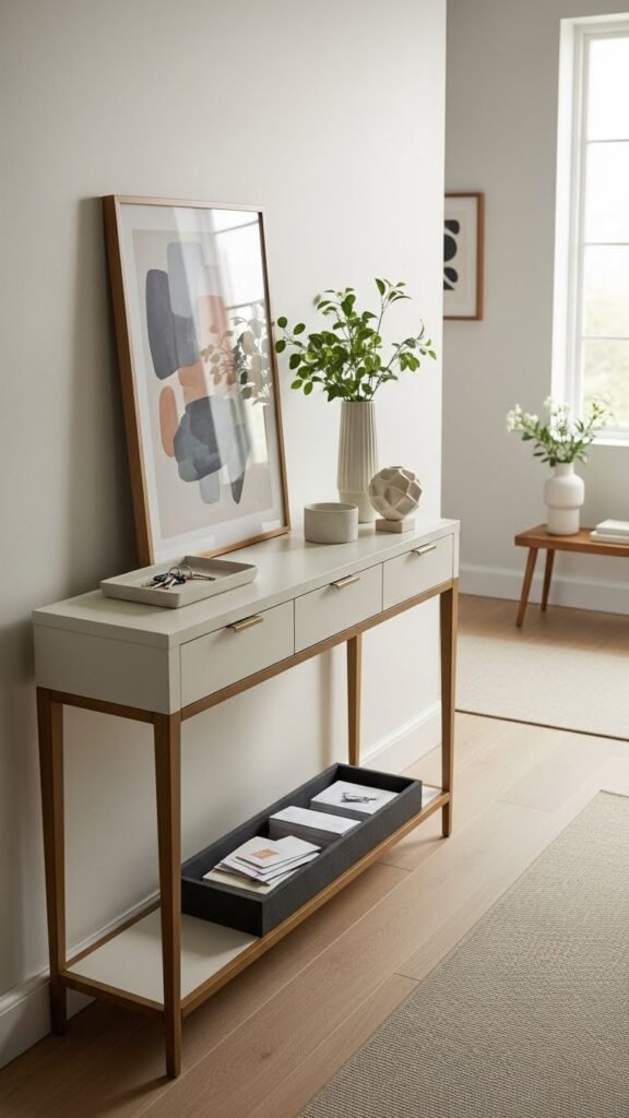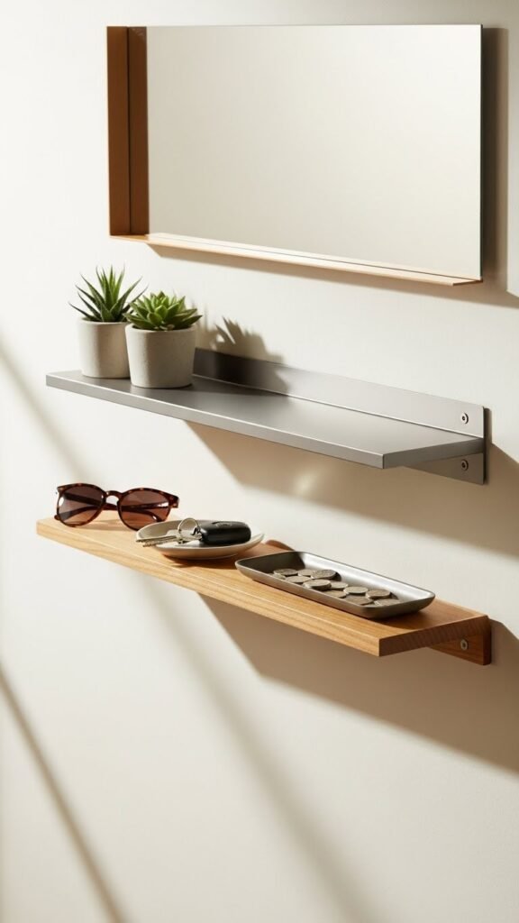 With a few slim floating shelves mounted at eye level, you’ll carve out instant storage for keys, sunglasses, and the little things that usually clutter your surfaces. Choose narrow wood or matte metal, anchored with hidden brackets for a clean, airy look. Add a couple of mini planters, a tray for change, and a slim mirror so you leave home feeling free and organized.