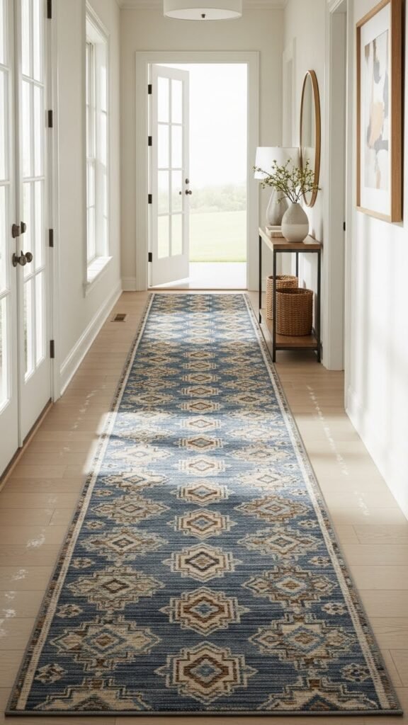Lay a patterned runner down the hallway to instantly define the path and add visual interest without overwhelming the space. You’ll choose scale and color to enhance entryway flow, use rug alignment to center with doors and furniture, and perform quick traffic mapping to place seams away from high-wear zones.