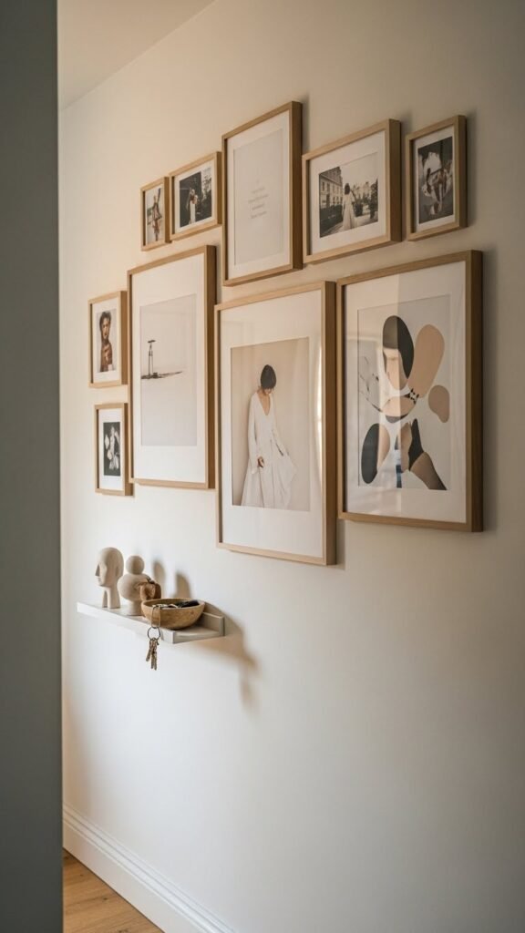 Bring that defined pathway to life by crowning the wall with a curated gallery that reflects your style and guides the eye. Mix scaled framed photo pieces with open prints and a mini shelf for small sculptures or keys. Arrange asymmetrically for effortless movement, choose cohesive frames and a restrained palette, and let the collection feel edited, personal, and freeing as guests arrive.