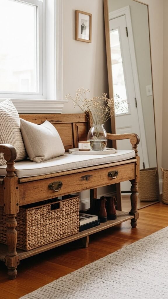 Anchoring your entryway with a vintage bench that doubles as storage brings character and function into one curated piece; pick one with visible patina, turned legs, or original hardware to let history inform your modern routine.