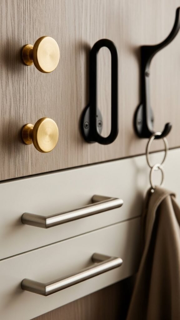 Though it might seem risky, mixing metallic hardware can instantly elevate your entryway by adding layered shine and unexpected depth; pair warm brass knobs with matte black hooks or brushed nickel pulls to create a curated, editorial look that reads intentional rather than mismatched.