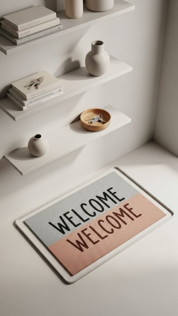 After mounting slim floating shelves for your everyday items, anchor the entry visually and functionally by framing a welcoming doormat that complements that neat, minimalist look.