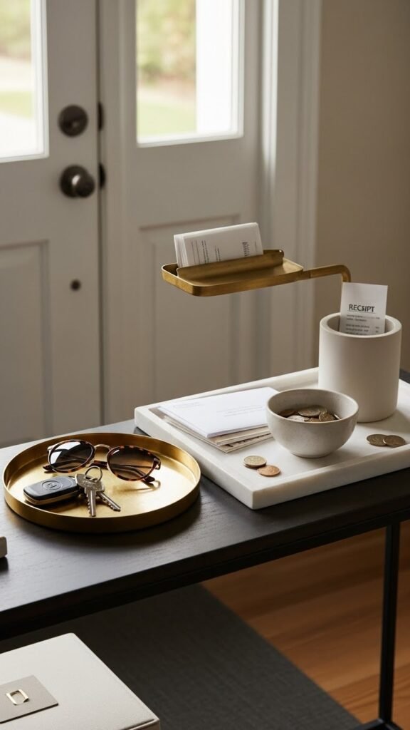 Position a brass tray near the door, pair it with a seasonal bowl for loose change, and keep one minimalist catchall for receipts to maintain calm, liberated entry.