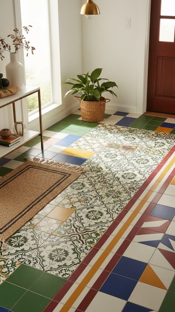 Brighten up your entry by anchoring the floor with colorful tiles that set the tone before you even reach the door; bold patterns or jewel-toned solids give the space instant personality while masking dirt and wear.