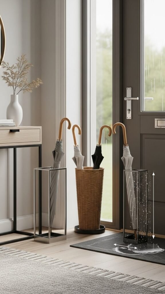 Bring in a slim umbrella stand to keep wet weather gear tidy and within reach; pick one that complements your entry’s scale and style so it looks intentional, not afterthought.