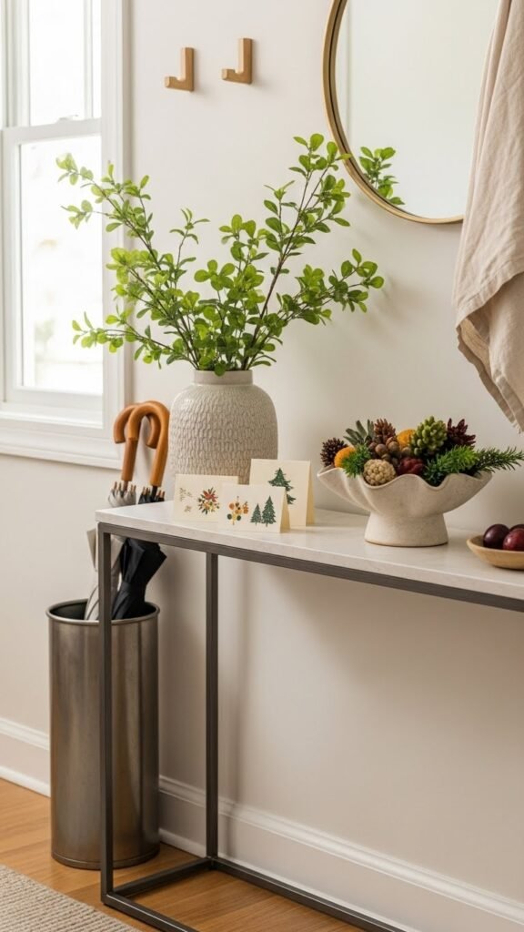 Once you’ve sorted practical items like an umbrella stand, use a slim side table to introduce a seasonal mood that feels curated, not cluttered.