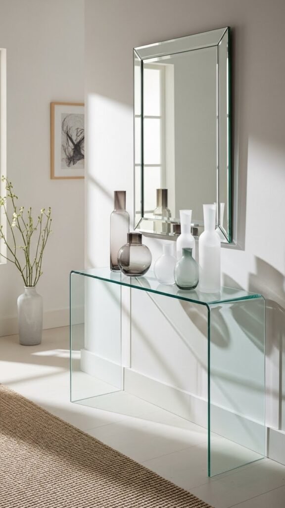 Drawing in light and air, glass pieces instantly make an entryway feel lighter and more modern—choose a slim console with a frosted or clear top, cluster a few graduated glass vases, or add a mirror with a delicate glass frame to amplify natural brightness.