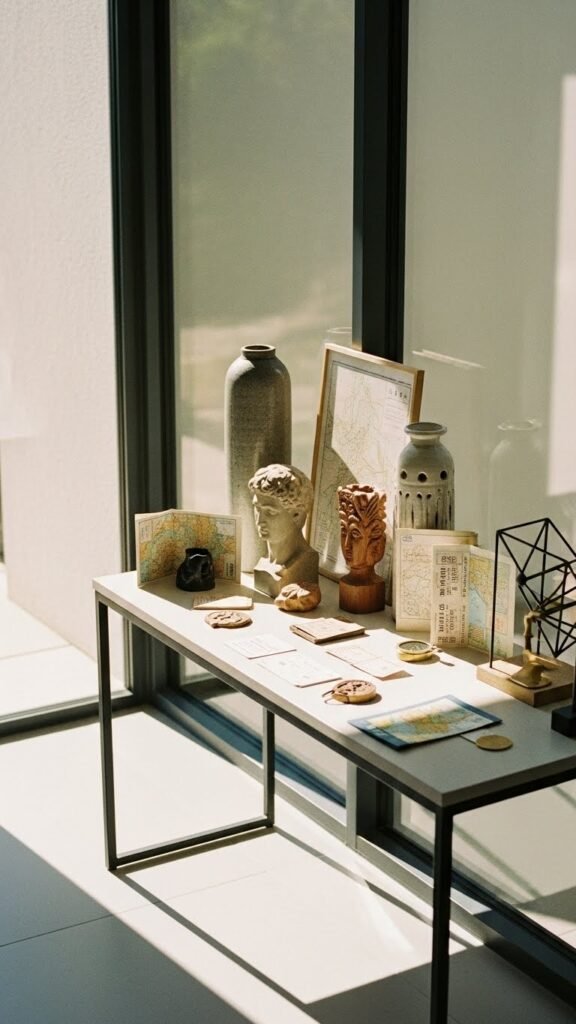 After letting glass amplify light and keep surfaces airy, layer in personality with travel mementos or sculptural pieces that anchor the space and tell your story. Curate travel talismans—small maps, carved tokens, ticket stubs—arranged with deliberate sculpture pairings to create rhythm. You’ll balance scale, texture, and negative space so the entry feels liberated, curated, and unmistakably yours.