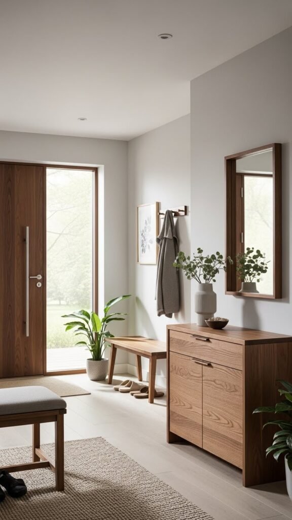 Often a medium wood tone is the simplest way to introduce warmth without overpowering your entry; choose oak, walnut, or teak finishes that show natural grain and pair them with neutral walls and glass to keep the space airy and modern.