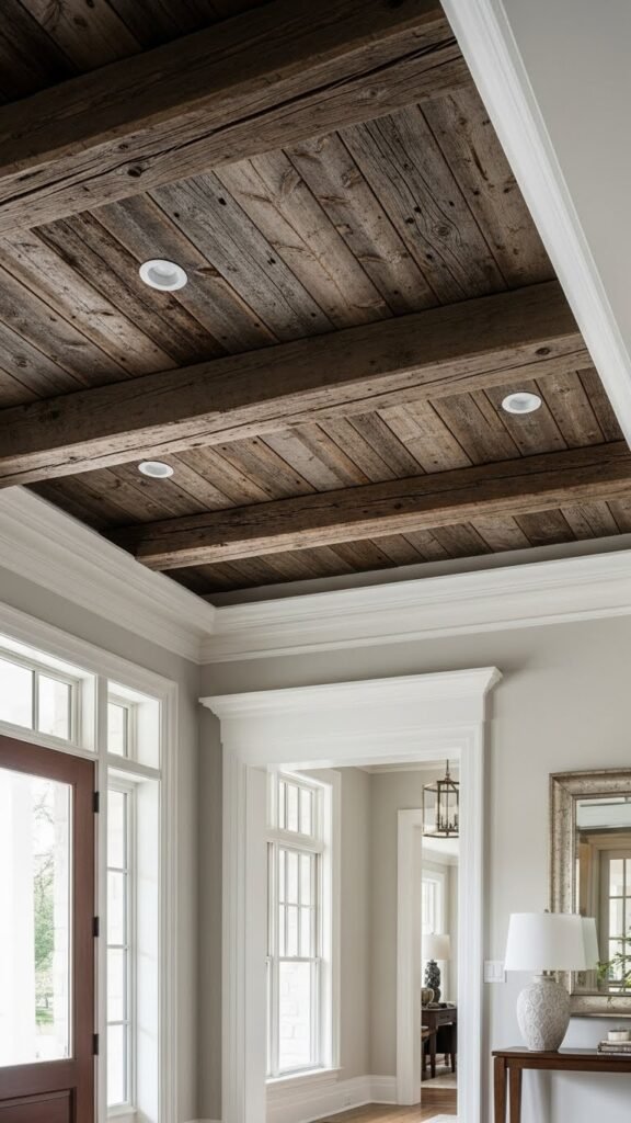 You’ll balance weathered beams and tongue and groove with white crown molding, paint painted rafters to coordinate, and highlight exposed joists for texture, creating an entryway that’s free, polished, and intentionally composed.
