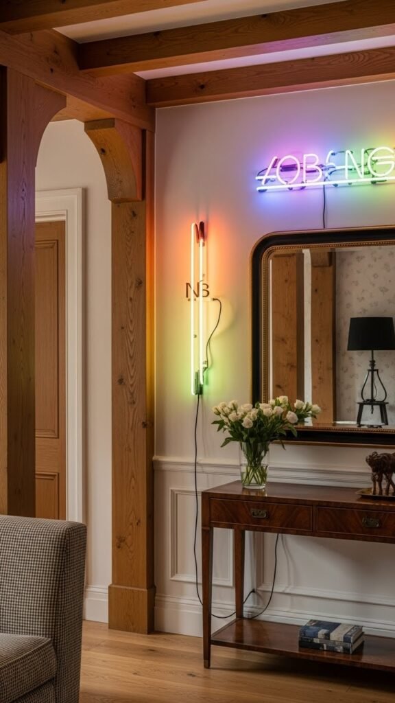 Moving from the warm textures of exposed beams and classic trim, introduce neon or bespoke light installations to give your entryway a contemporary jolt without undoing its layered charm. You’ll choose neon artwork or refined LED typography to punctuate a console or mirror, balancing bold color and crisp lines. Keep wiring discreet and scale proportional so the statement feels liberated, not loud.
