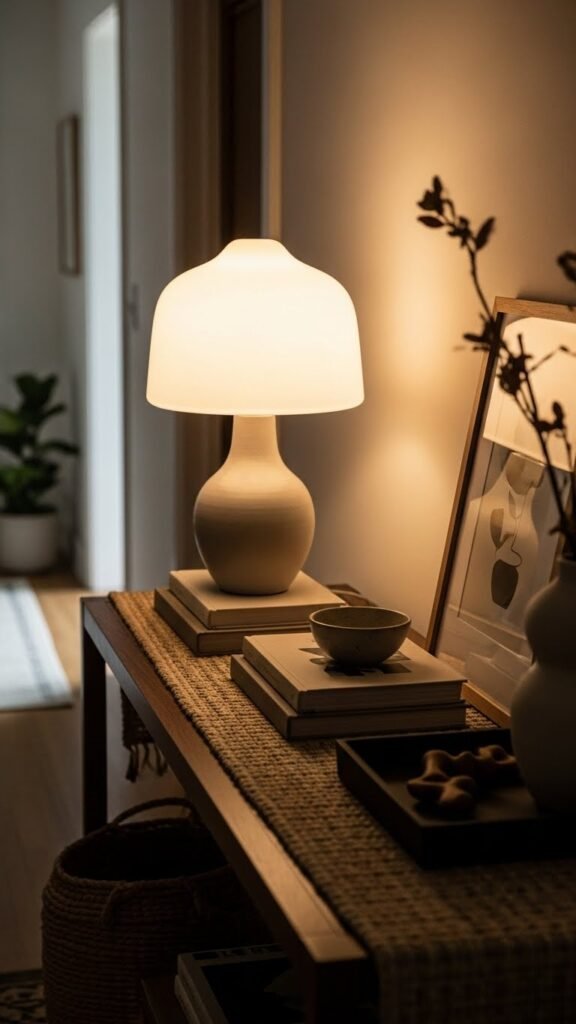 You place a lamp on the console to cast a soft glow, highlight layered textures, and create an inviting pause as you come home. Choose sculptural forms and dimmable bulbs so light feels intentional, effortless, and freeing.