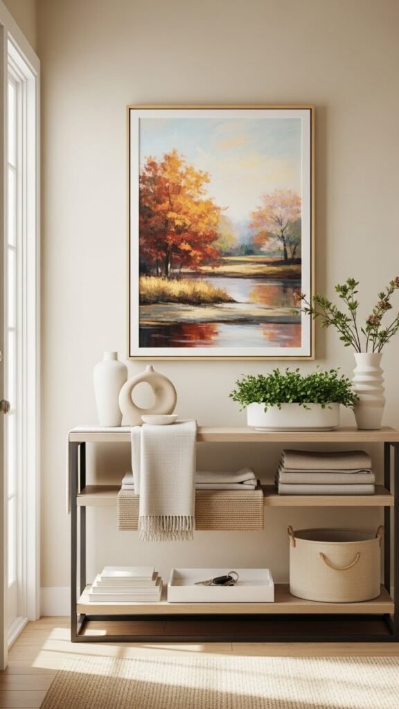 Once your door sets the tone, layer in a curated vignette that greets visitors with personality and seasonal flair. Choose one focal artwork and switch pieces with an art rotation to keep things fresh. Add sculptural objects, a small planter, and textiles that echo seasonal colorways. Keep scale balanced, surfaces clutter-free, and arrangements effortless so your entry feels open and inviting.